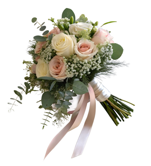 A delicate and romantic bouquet crafted with white and blush pink roses, accented with fine...