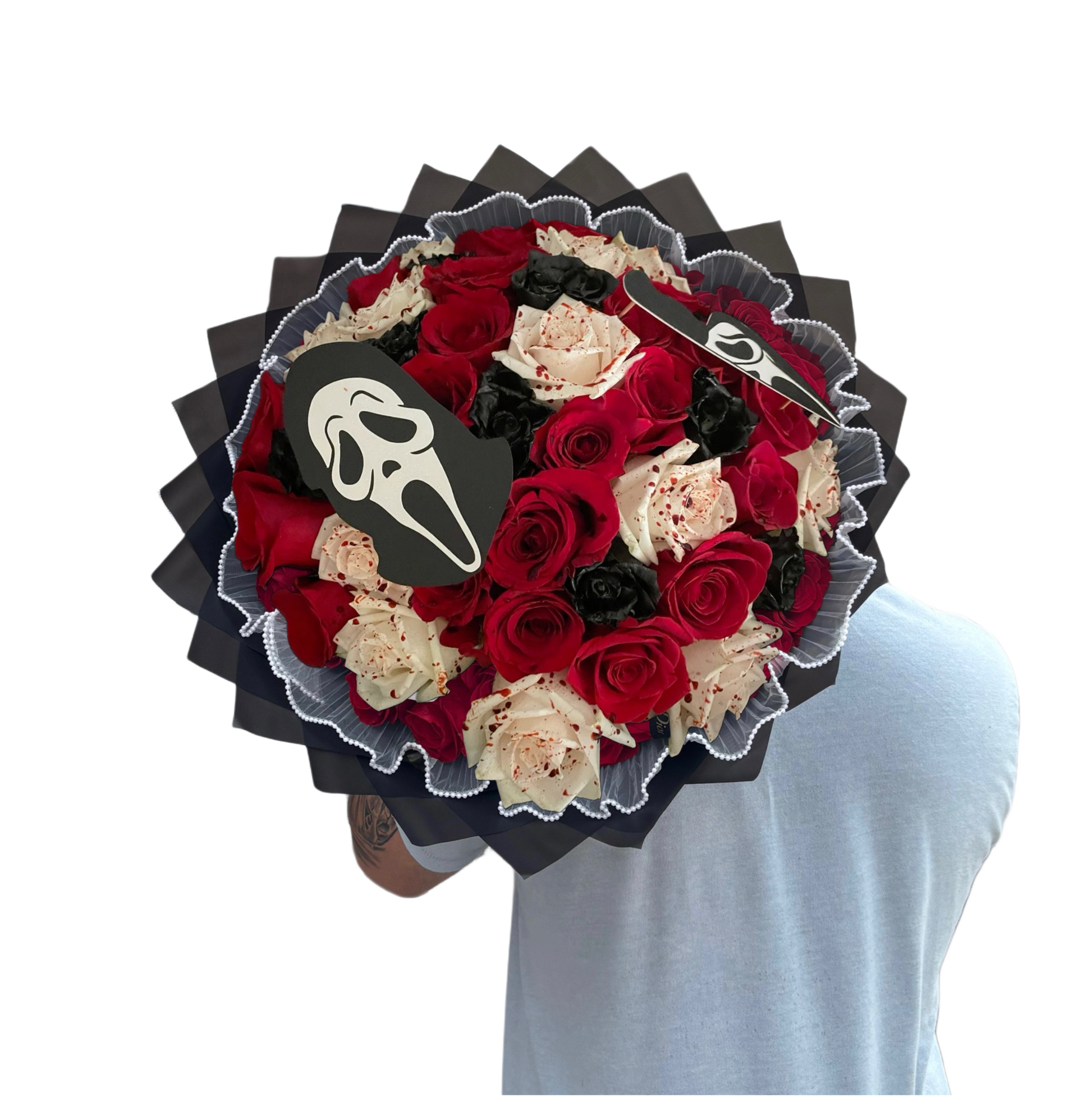 The Bloody Romance bouquet is where passion meets horror. A stunning mix of deep red, black, and ivory roses, splattered with “blood” details and decorated with the iconic Scream mask and knife, creating the ultimate dark love statement.