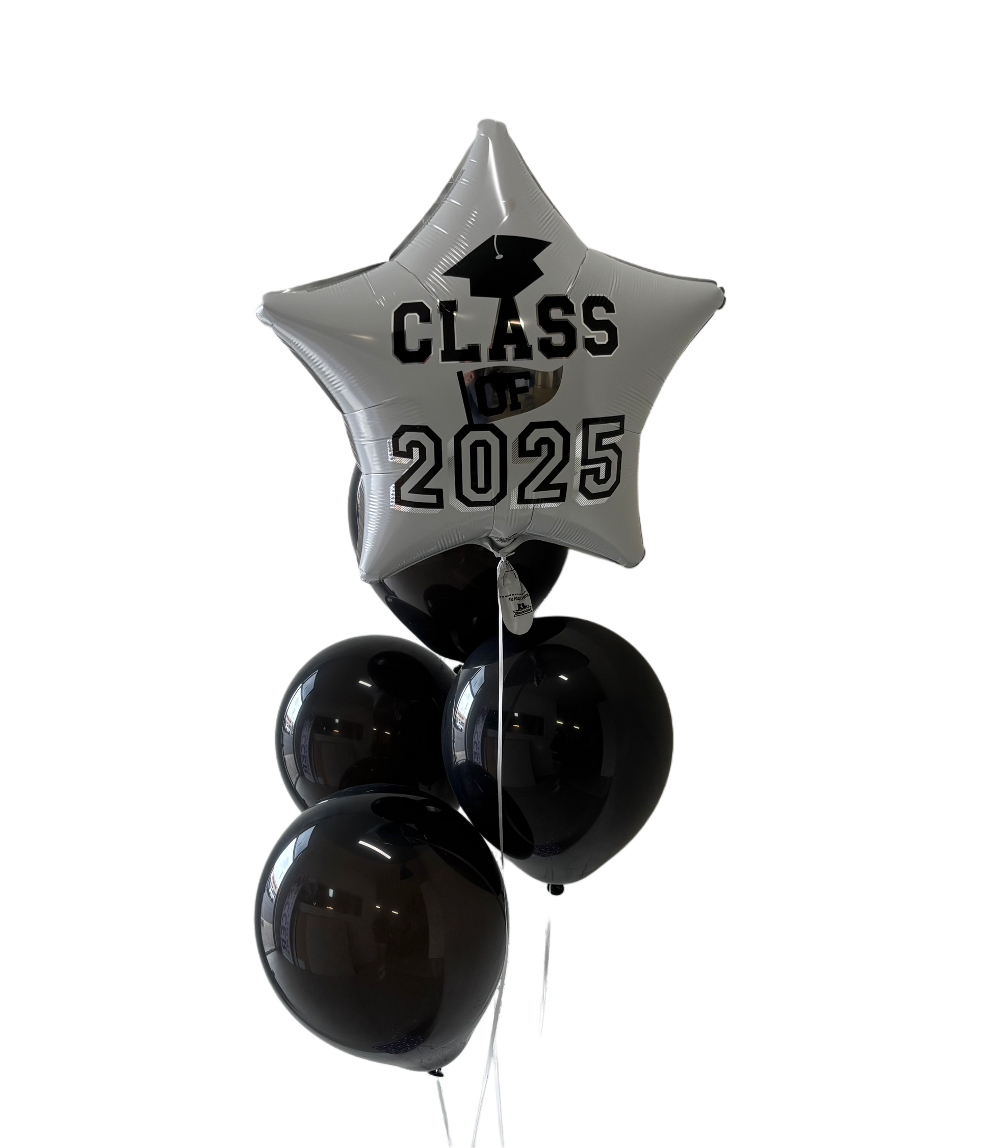 This sophisticated set includes one large silver star-shaped foil balloon printed with “Class of 2025,” and four helium-inflated black latex balloons. A sleek and modern choice to celebrate the graduate in style—perfect for ceremonies, photos, or surprise deliveries.