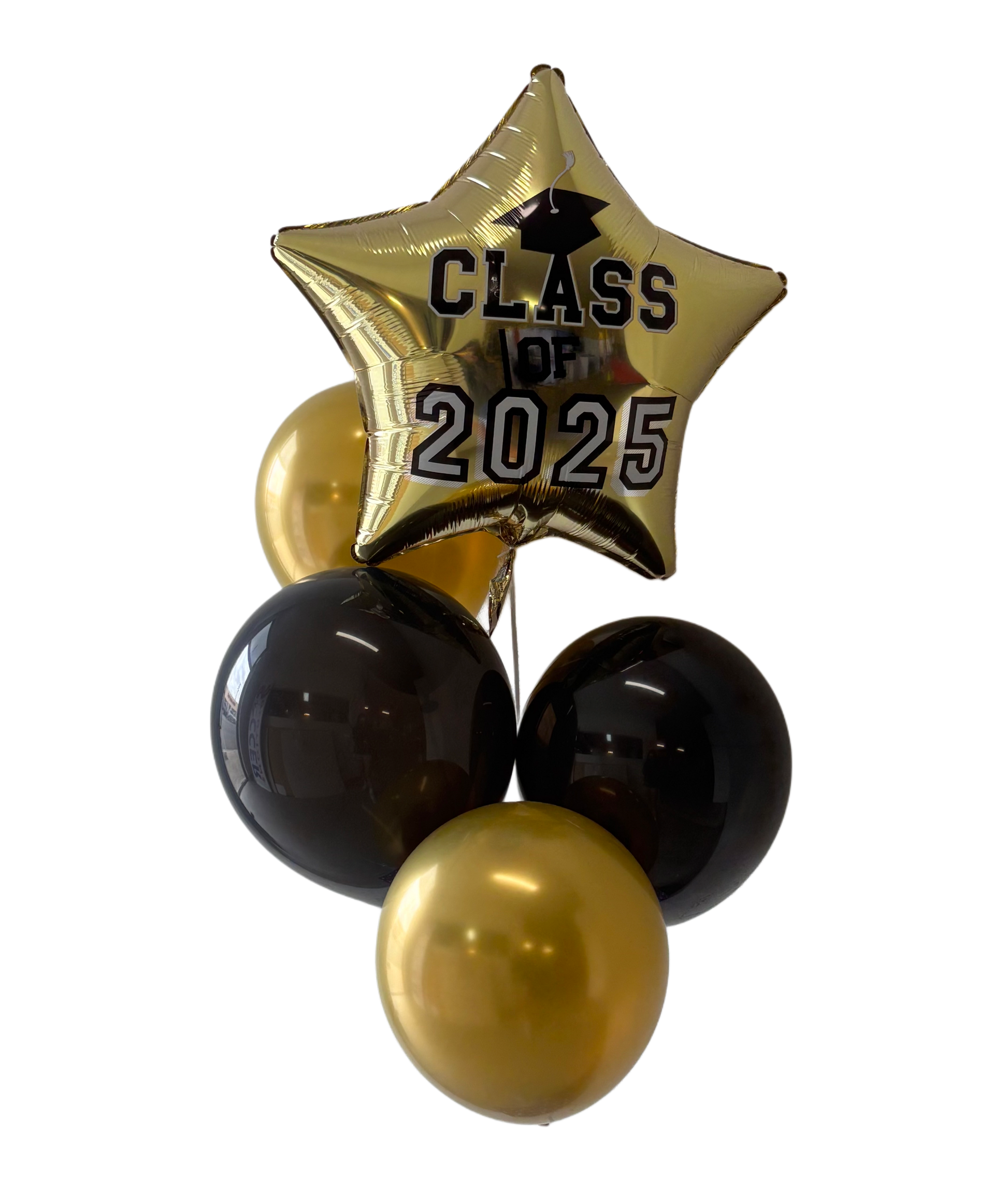This striking bundle includes one large gold star-shaped foil balloon with “Class of 2025” lettering and four helium-filled latex balloons in rich black and metallic gold tones. It’s the perfect statement piece for any graduation celebration or gift delivery.