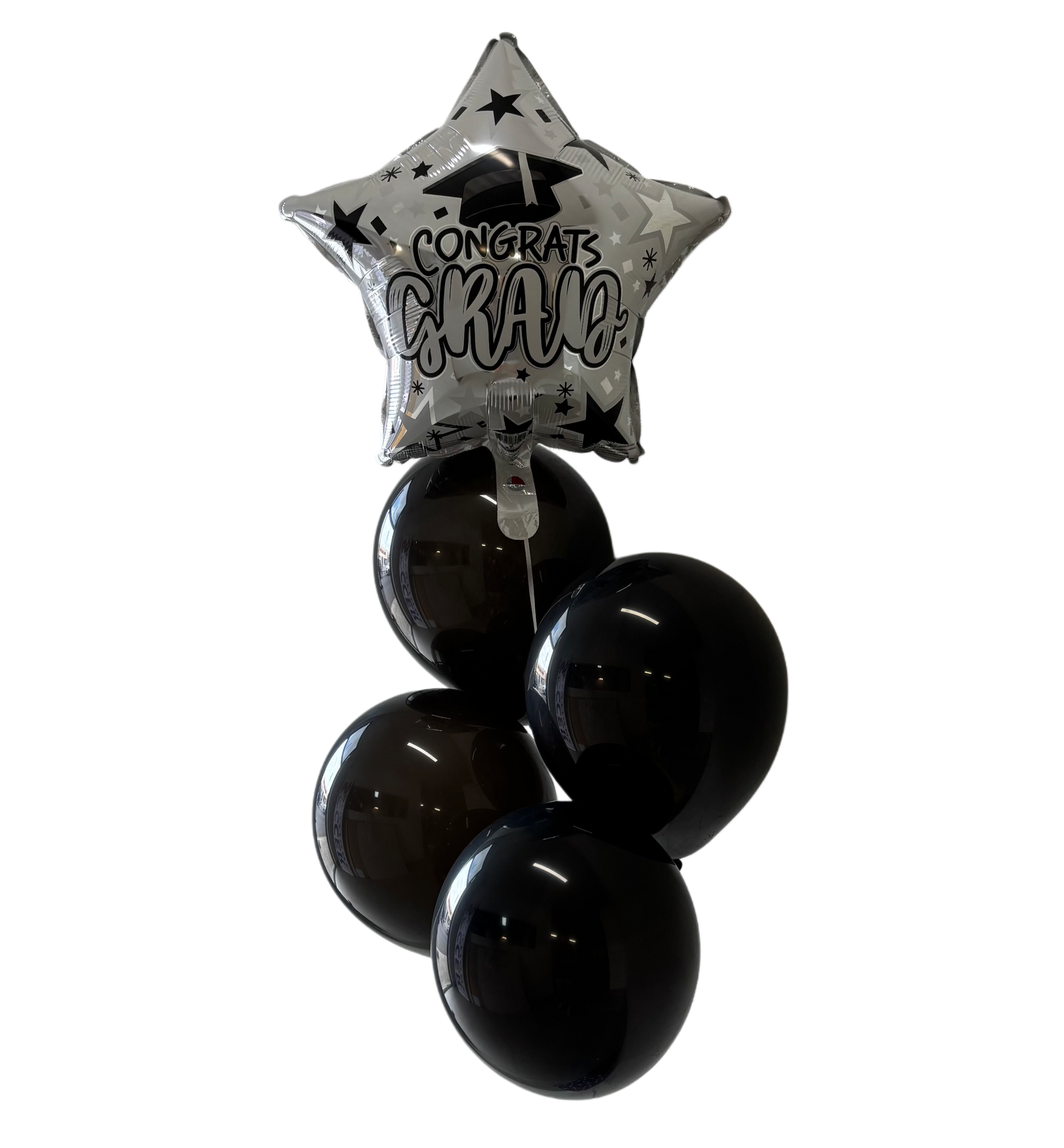 This bold and modern arrangement features one large star-shaped foil balloon with a “Congrats Grad” message, complemented by four sleek black helium-inflated latex balloons. A perfect match for any graduation celebration, celebration, especially those with a classic black and silver theme.