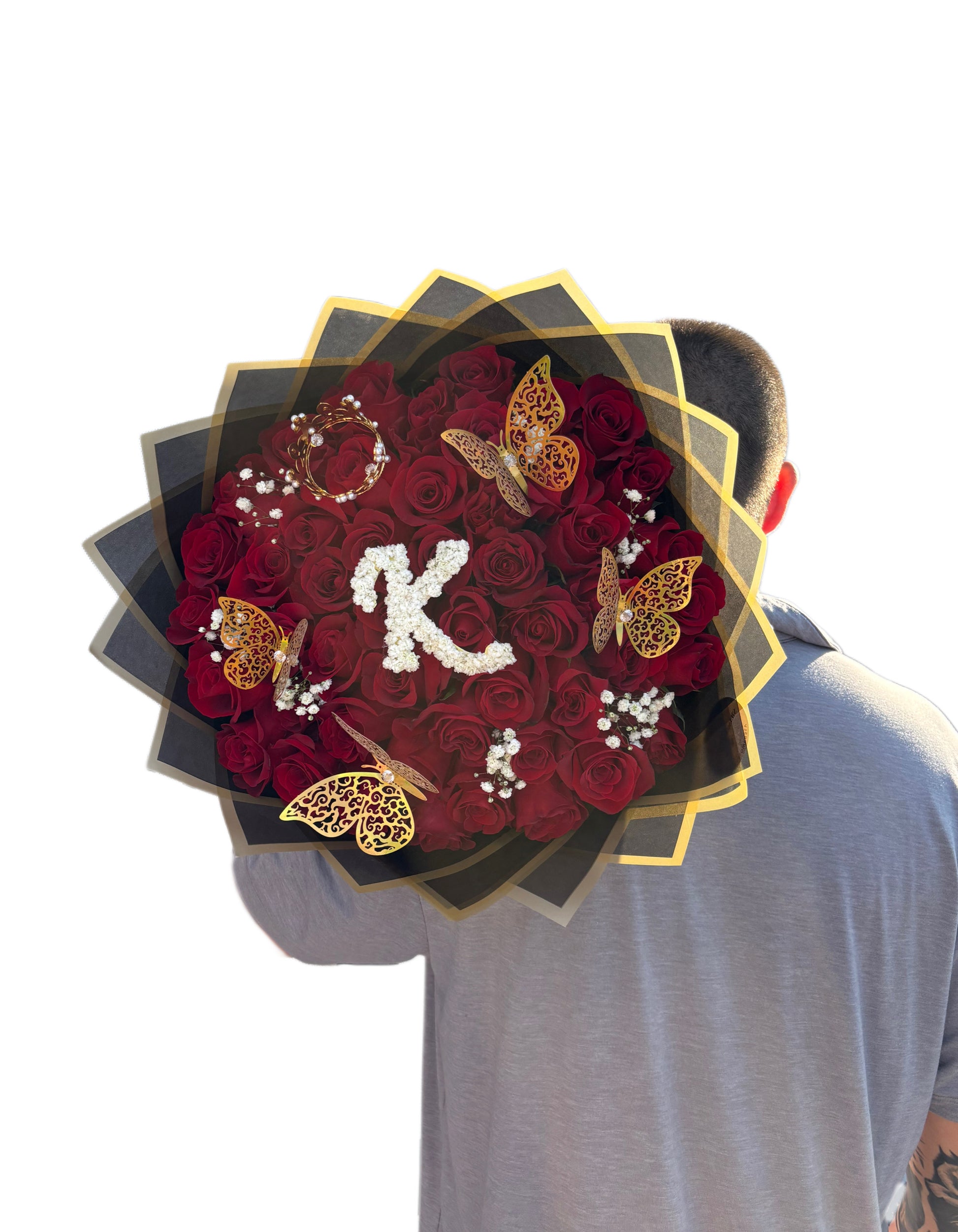 An elegant bouquet of premium red roses, decorated with golden butterflies and delicate gypsophila details, with the individual initial in the center to make it unique. Perfect to surprise on anniversaries, birthdays or any special occasion.