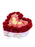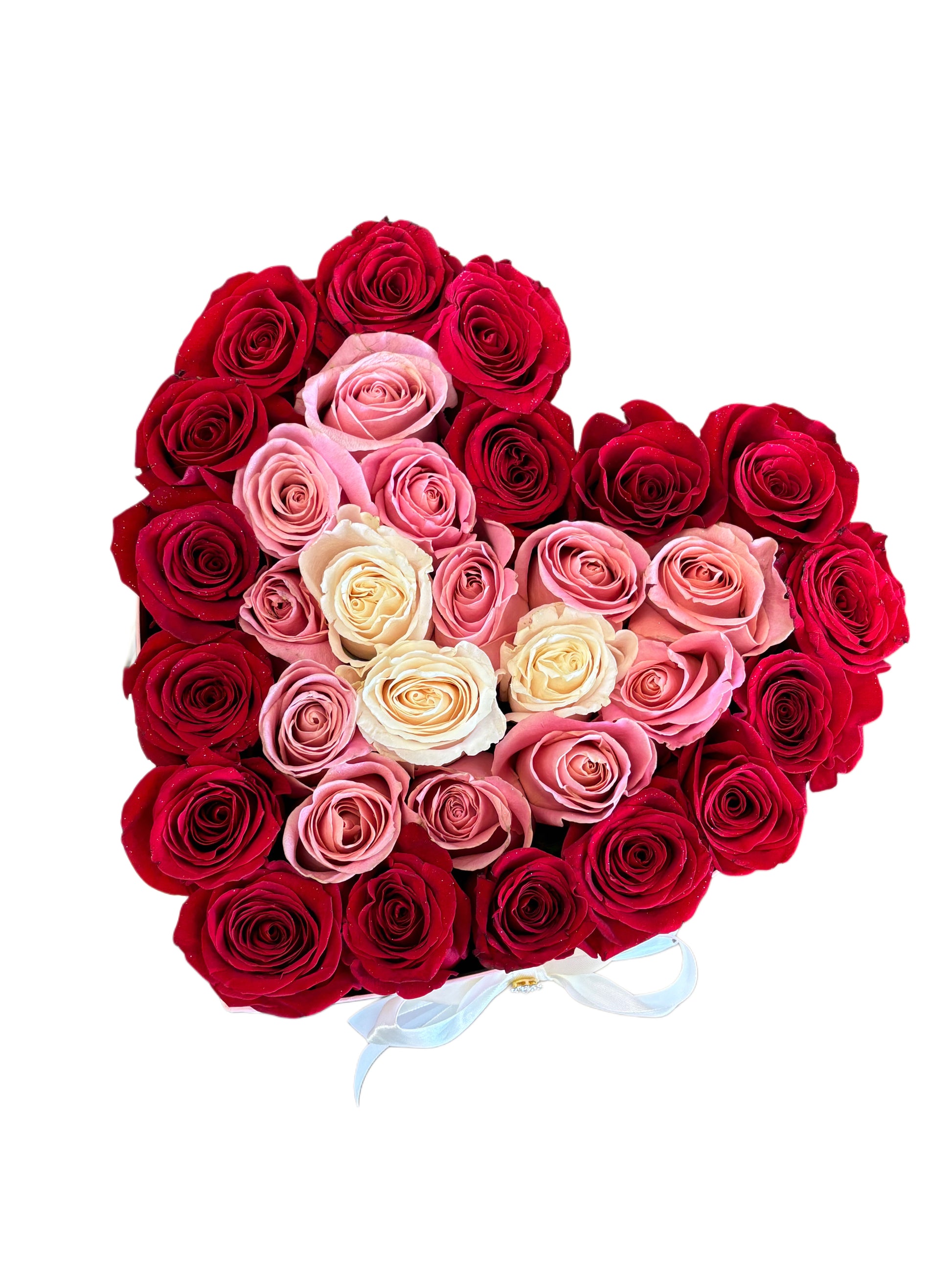 A hand-crafted heart box filled with fresh premium roses in romantic tones of red, pink, and cream. Perfect for proposals, anniversaries, and luxury flower gifting.