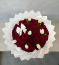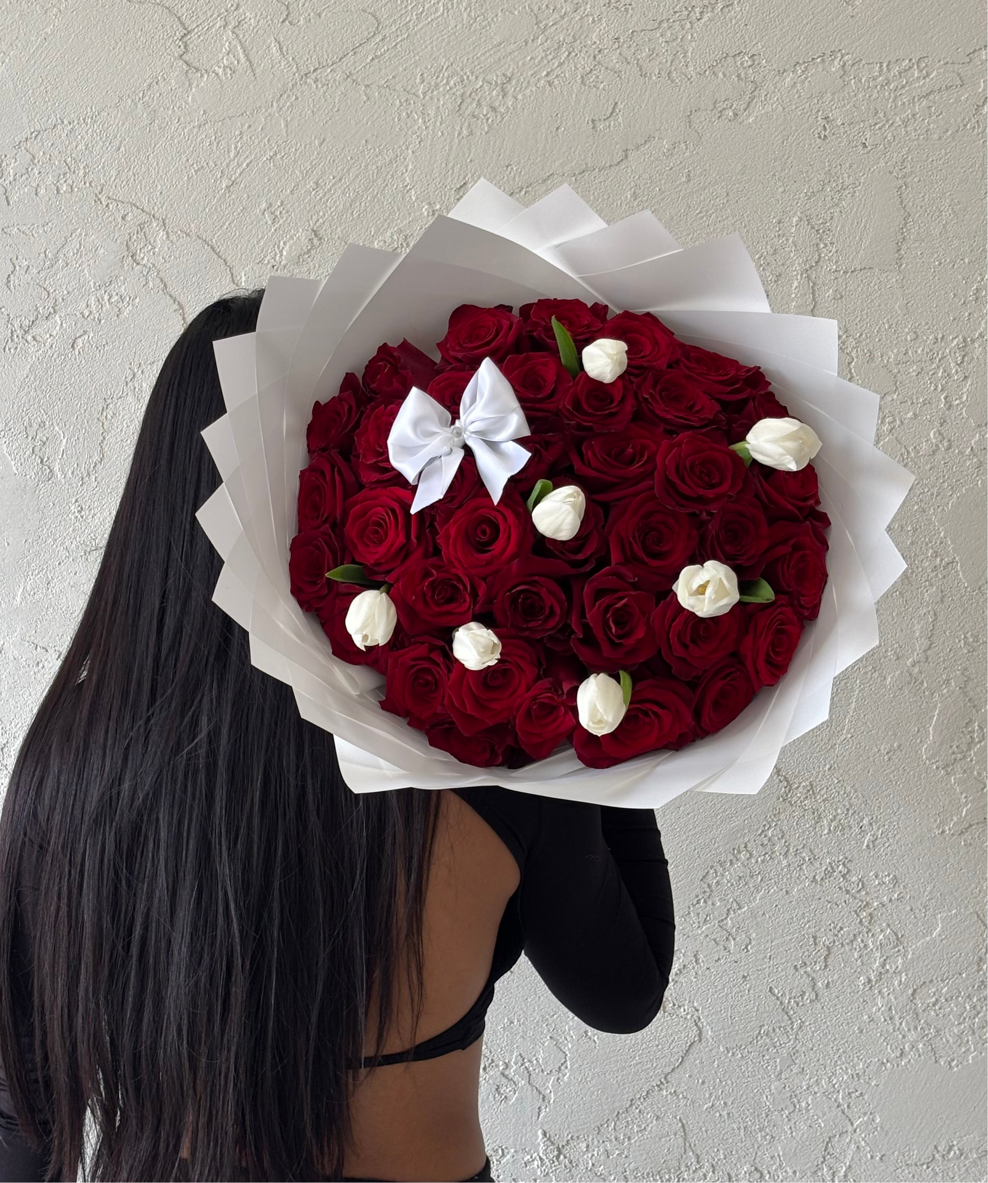 An elegant mix of red roses and white tulips wrapped in layered white paper with a satin bow.