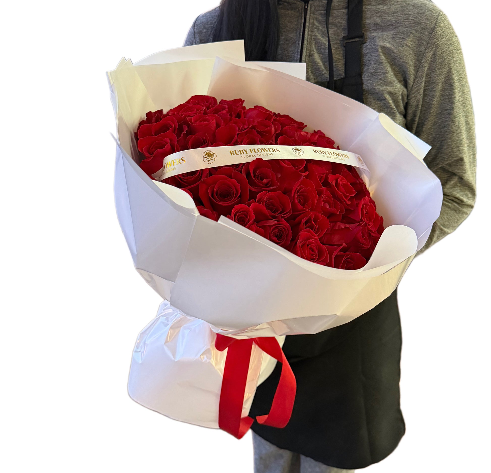 An intense and sophisticated bouquet composed of premium red roses, carefully selected for their deep color and perfect shape.