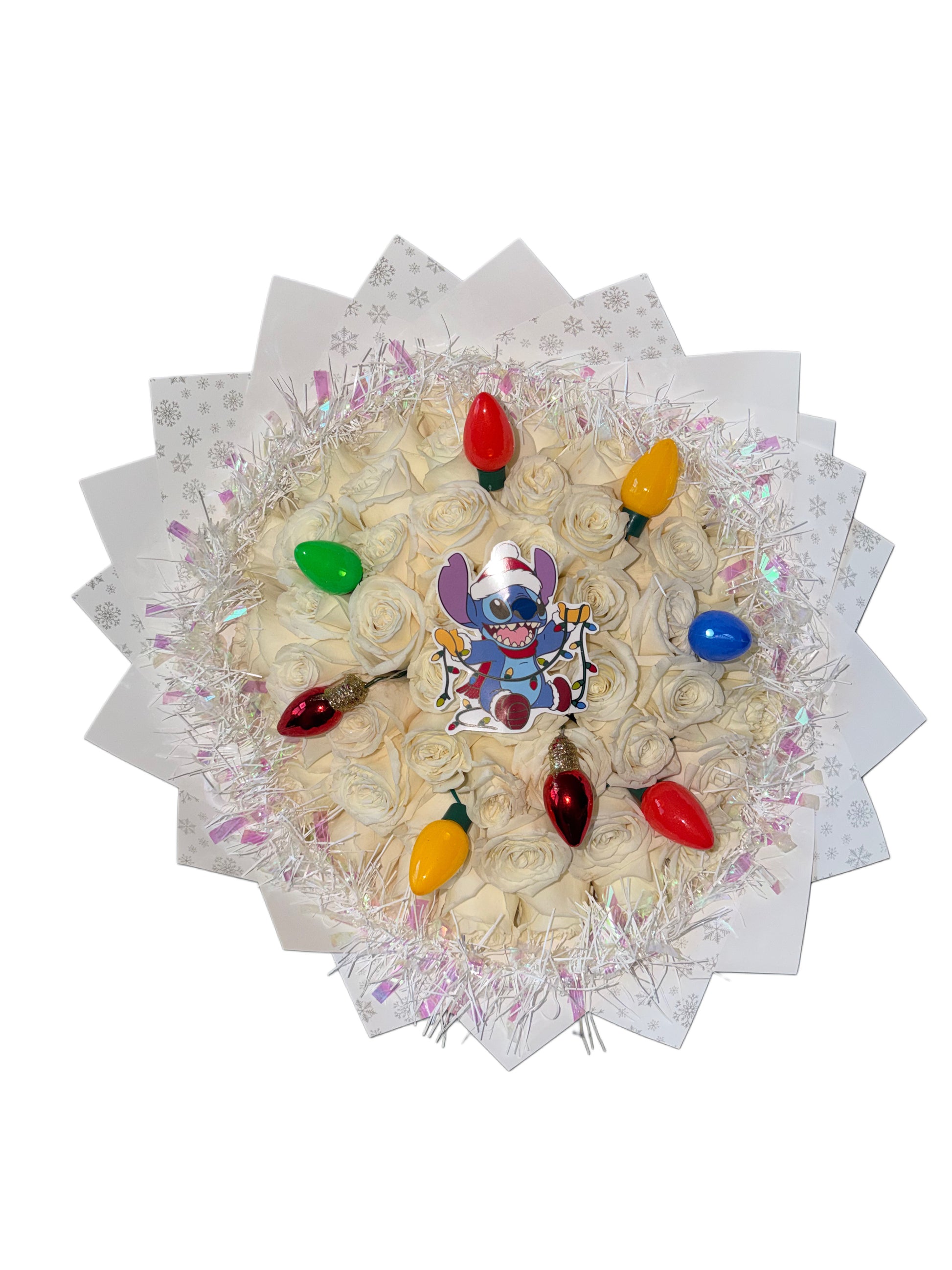 A festive bouquet featuring white roses, colorful bulb lights, and a cute holiday Stitch. A fun and unique gift to brighten the Christmas season.